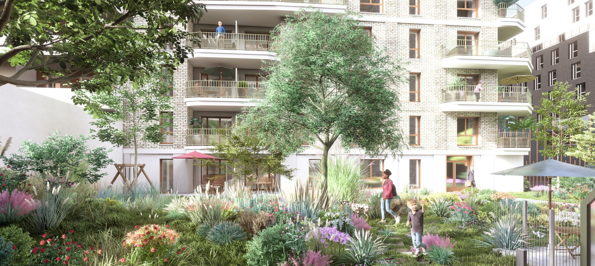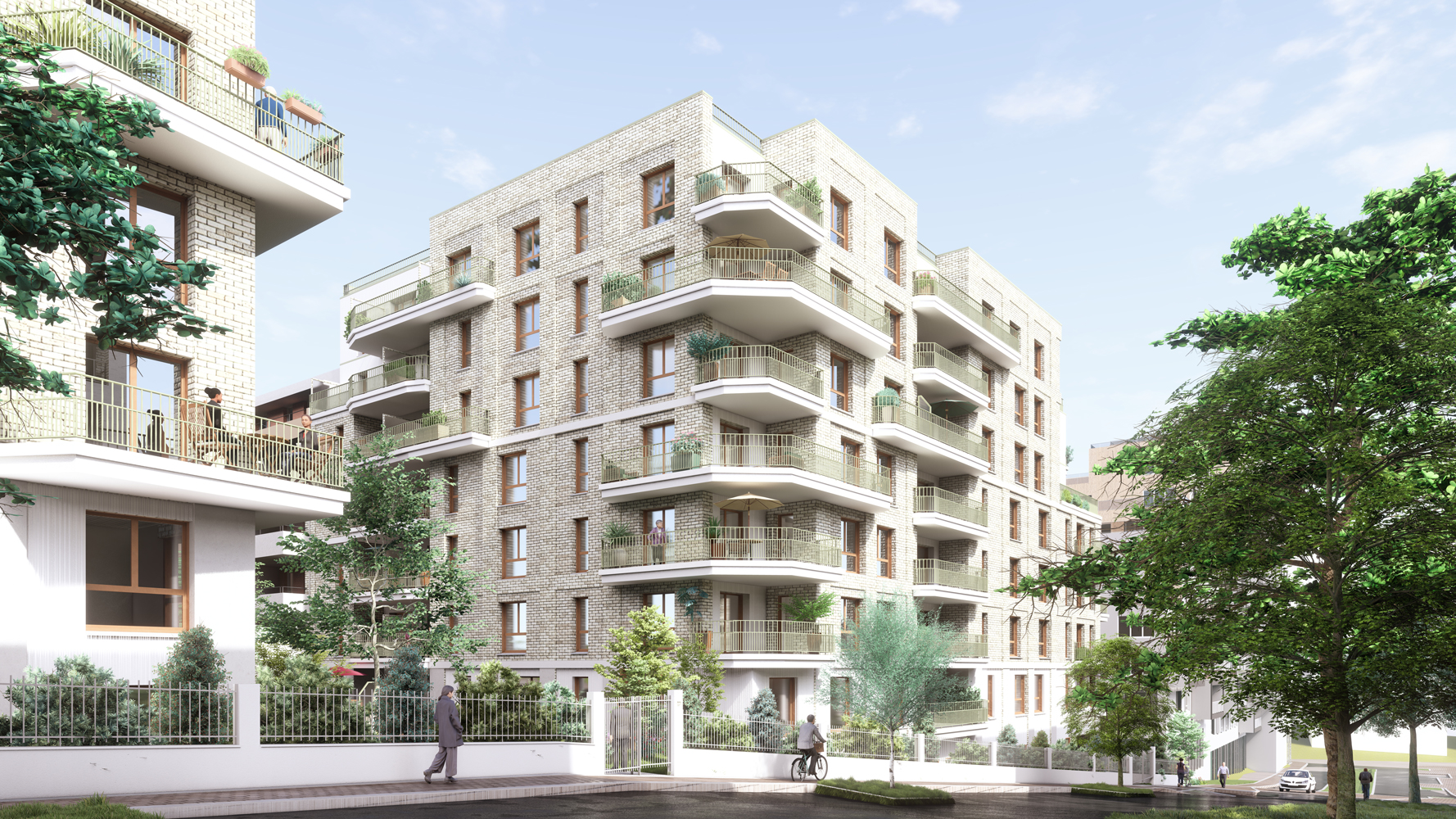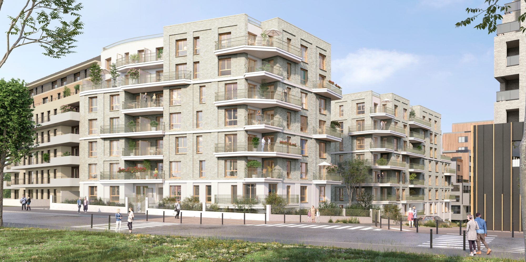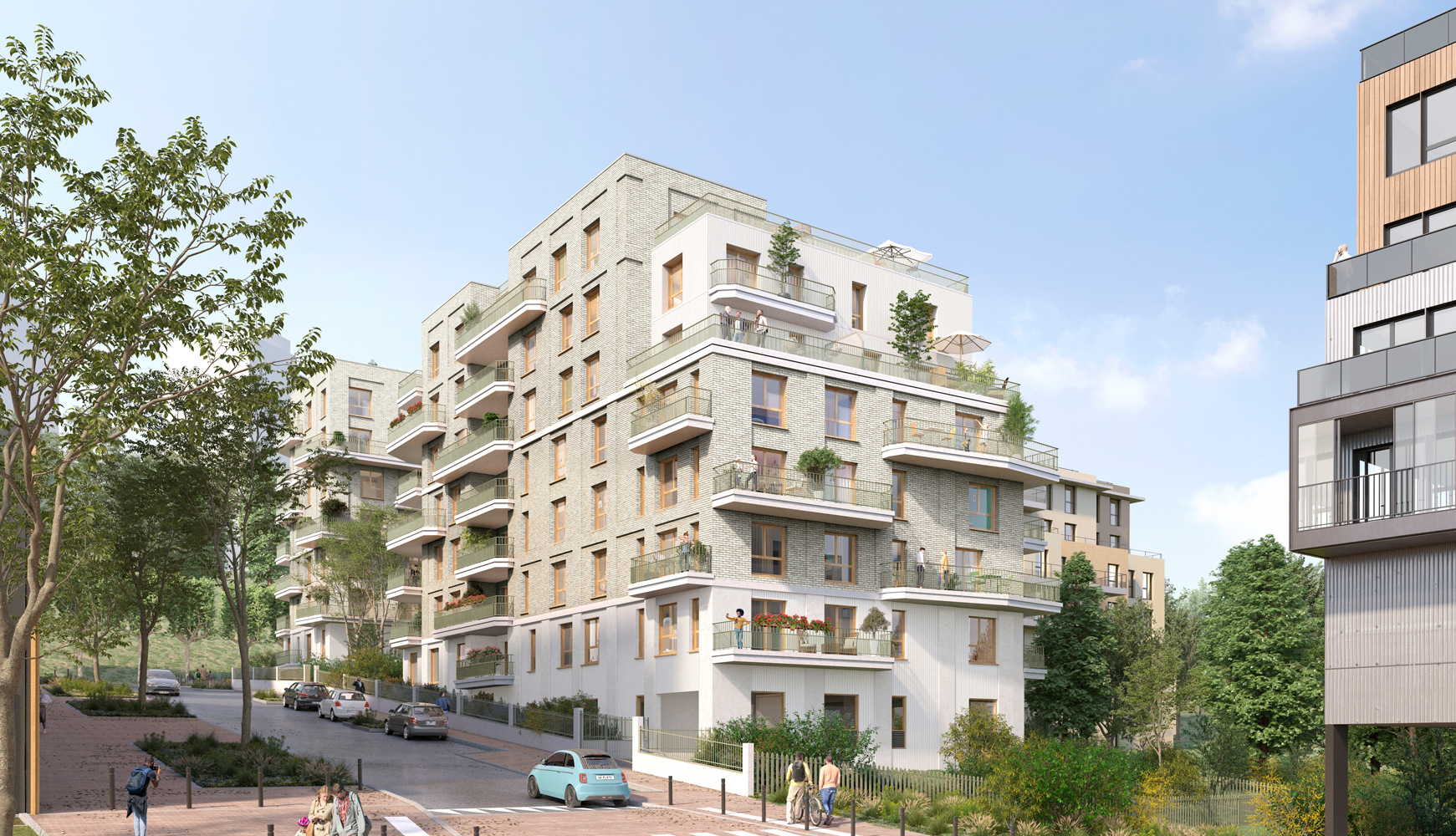 Chaque logement bénéficie d'un ensoleillement optimal et d'espaces extérieurs généreux, les appartements à partir du T3 profitant d'une double orientation qui enrichit leur qualité de vie. L'architecture développe une matérialité pérenne et sobre, structurée autour de la brique claire organisée selon une trame soignée. Le dialogue avec le bois et l'enduit crée une richesse tactile adaptée à toutes les échelles, du quartier à la ville, affirmant une identité architecturale contemporaine et intemporelle.