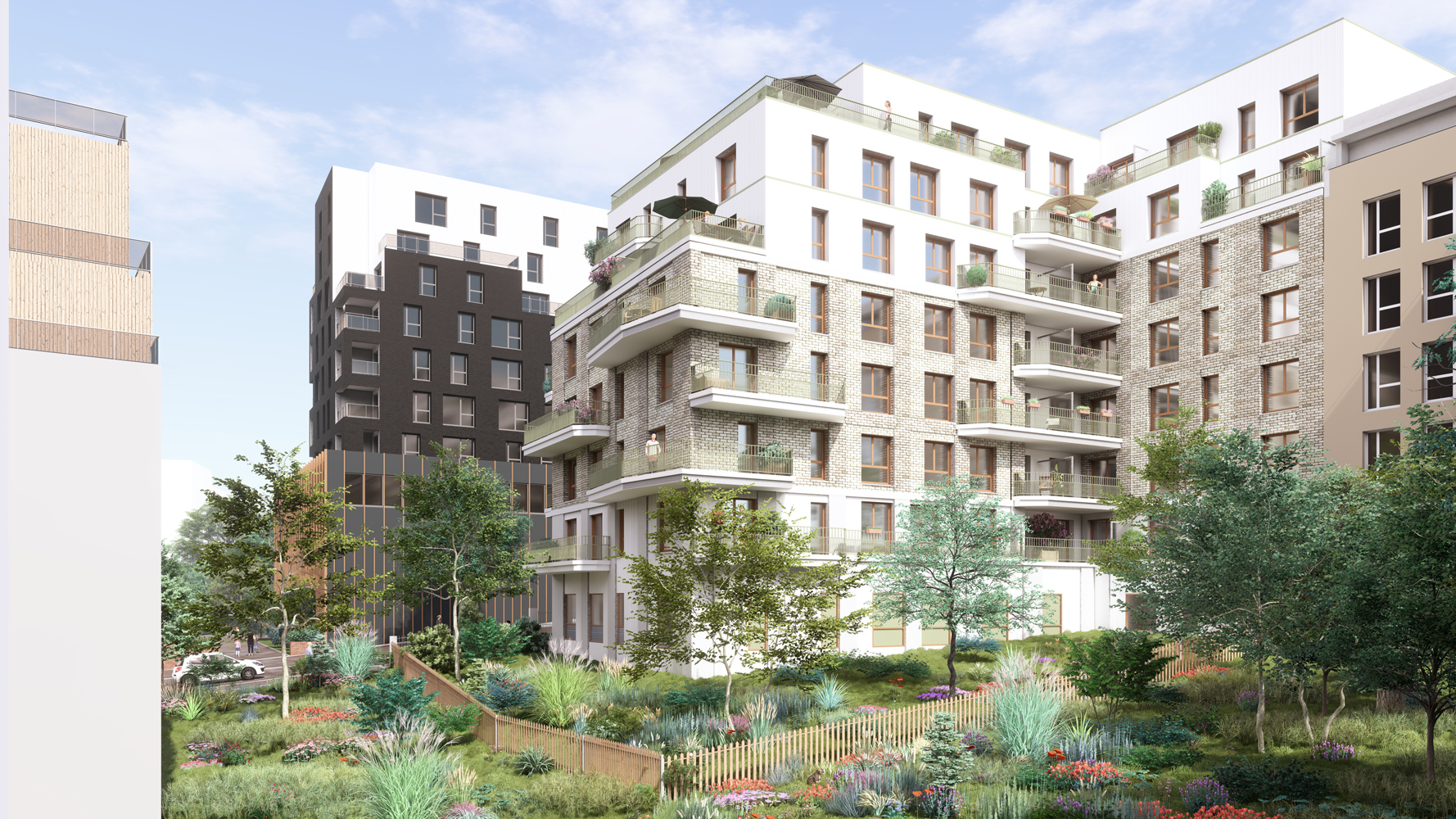 L'organisation architecturale met en valeur deux espaces végétalisés structurants, créant des respirations vertes qui bénéficient tant aux résidents qu'aux usagers de l'espace public. Le projet distingue clairement deux programmes complémentaires : le bâtiment A à l'angle Gabriel Péri / Arnaud Beltrame accueille des logements sociaux, tandis que le bâtiment B côté nord propose des logements en accession libre. Cette mixité programmatique contribue à la diversité sociale du quartier.