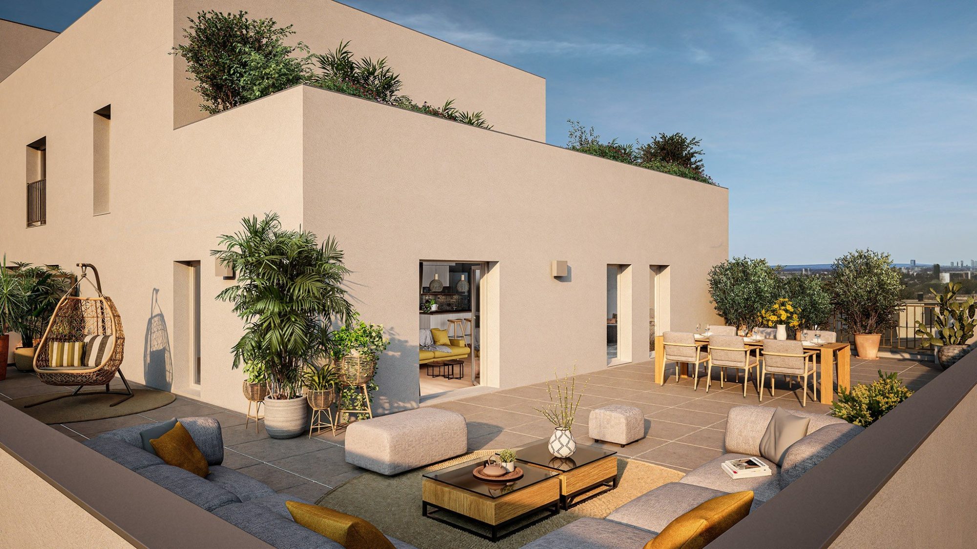 Le bâtiment A développe un épannelage progressif du R+4+2+Attiques côté avenue au R+2 sur la sente, créant une transition douce entre ces échelles urbaines distinctes. Les deux niveaux d'attique et le R+6, en retrait de 3 mètres des façades, allègent la perception du volume tout en générant des terrasses généreuses.