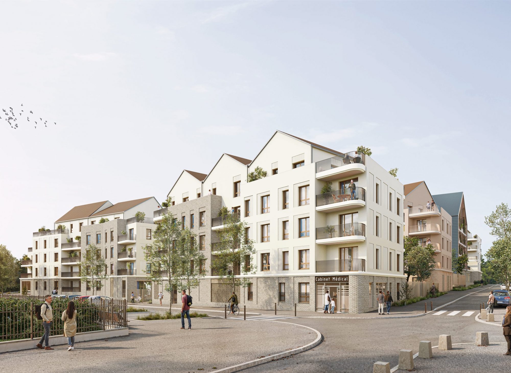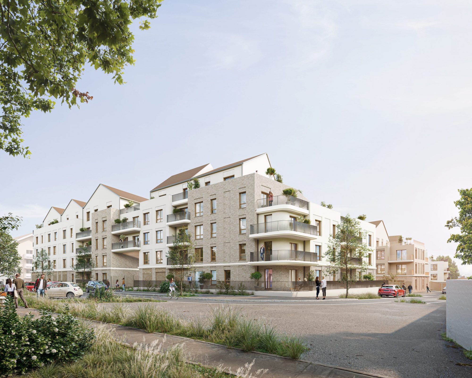 La composition urbaine repose sur l’implantation de plusieurs volumes bâtis, organisés de manière à définir un cœur d’îlot paysager généreux et traversant. Les bâtiments s’implantent majoritairement à l’alignement, tout en intégrant des retraits, des failles et des porches qui rythment les façades et favorisent les continuités piétonnes et visuelles entre l’espace public et les jardins intérieurs. L’épannelage progressif des hauteurs accompagne la transition vers les secteurs pavillonnaires, tandis que les émergences en attique, conçues comme des « maisons sur les toits », participent à une lecture domestique et qualitative du projet.