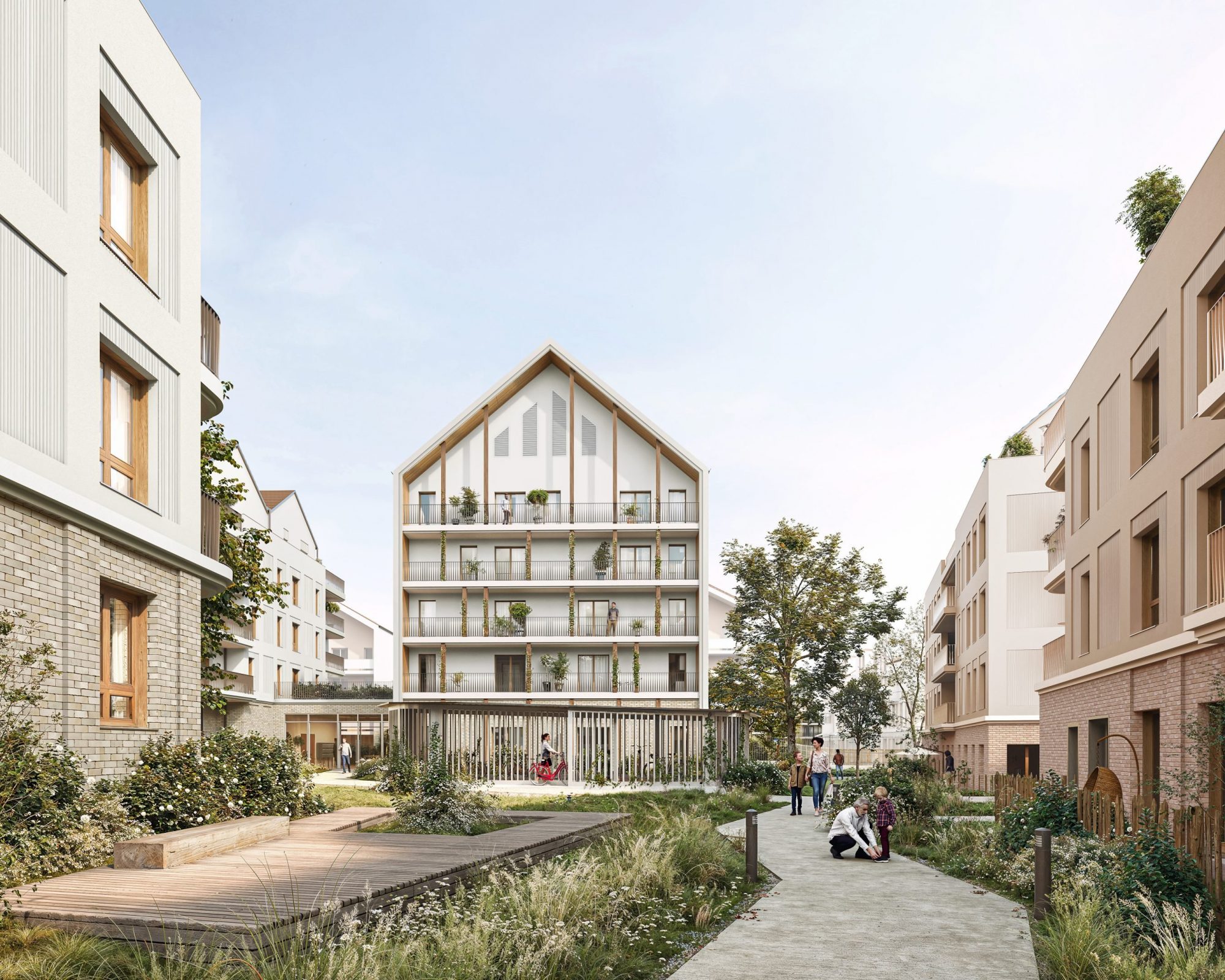 Une attention particulière est portée à la relation entre architecture et paysage. Le cœur d’îlot est conçu comme un véritable jardin habité, inspiré du principe du jardin « punk », favorisant la biodiversité, la diversité des ambiances végétales et une gestion raisonnée des eaux pluviales. Les cheminements doux, les espaces partagés et les lisières paysagères structurent un cadre de vie apaisé, propice aux usages quotidiens.