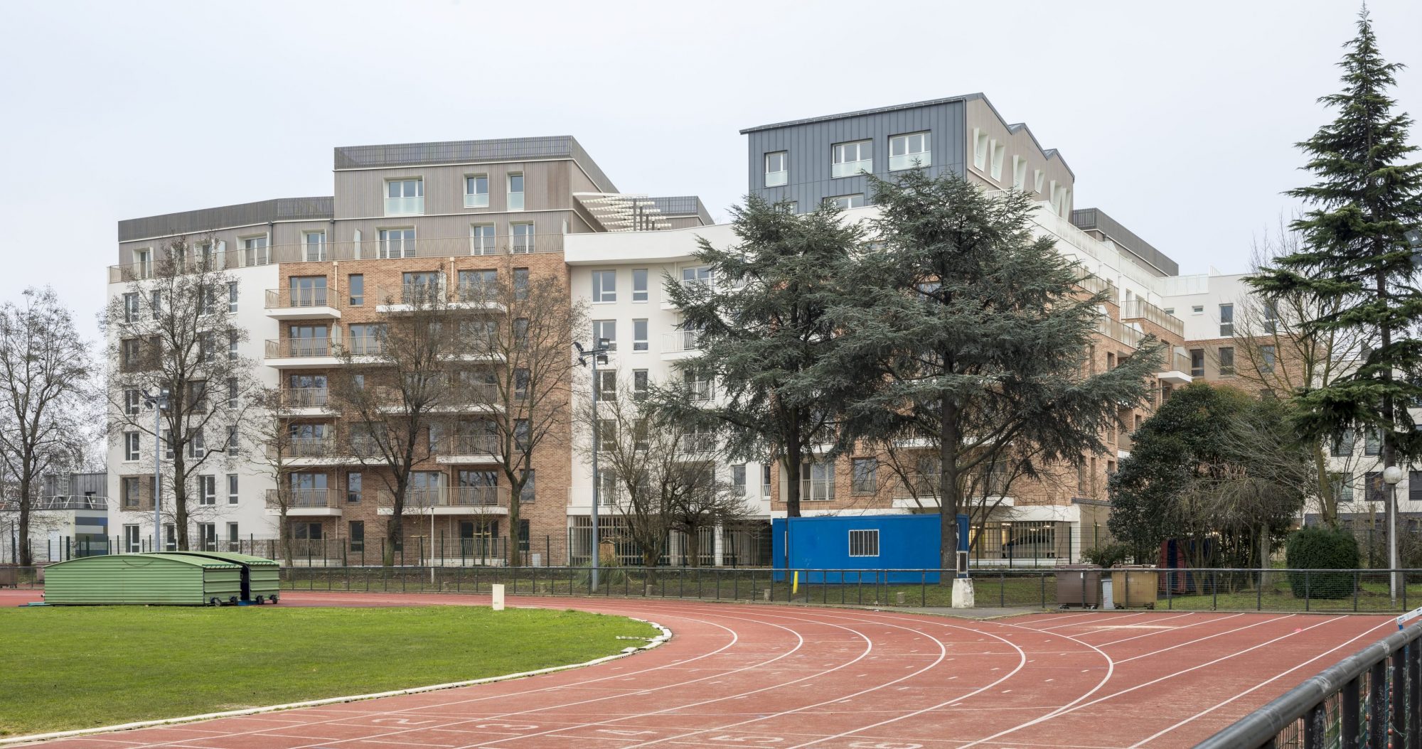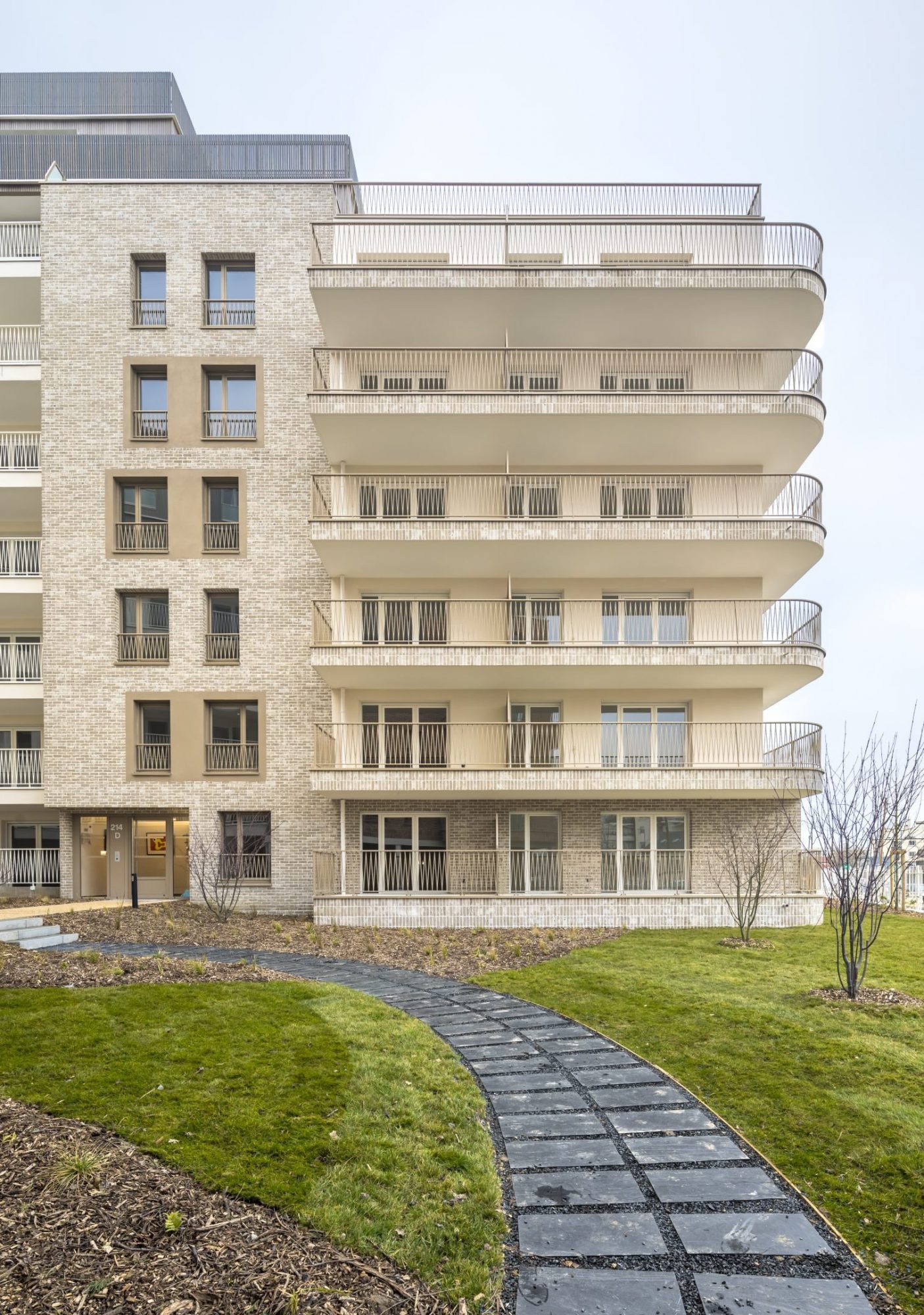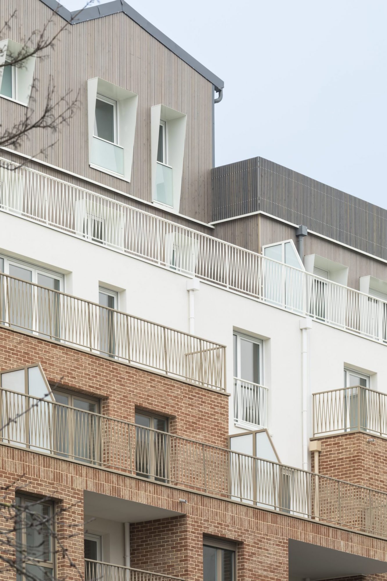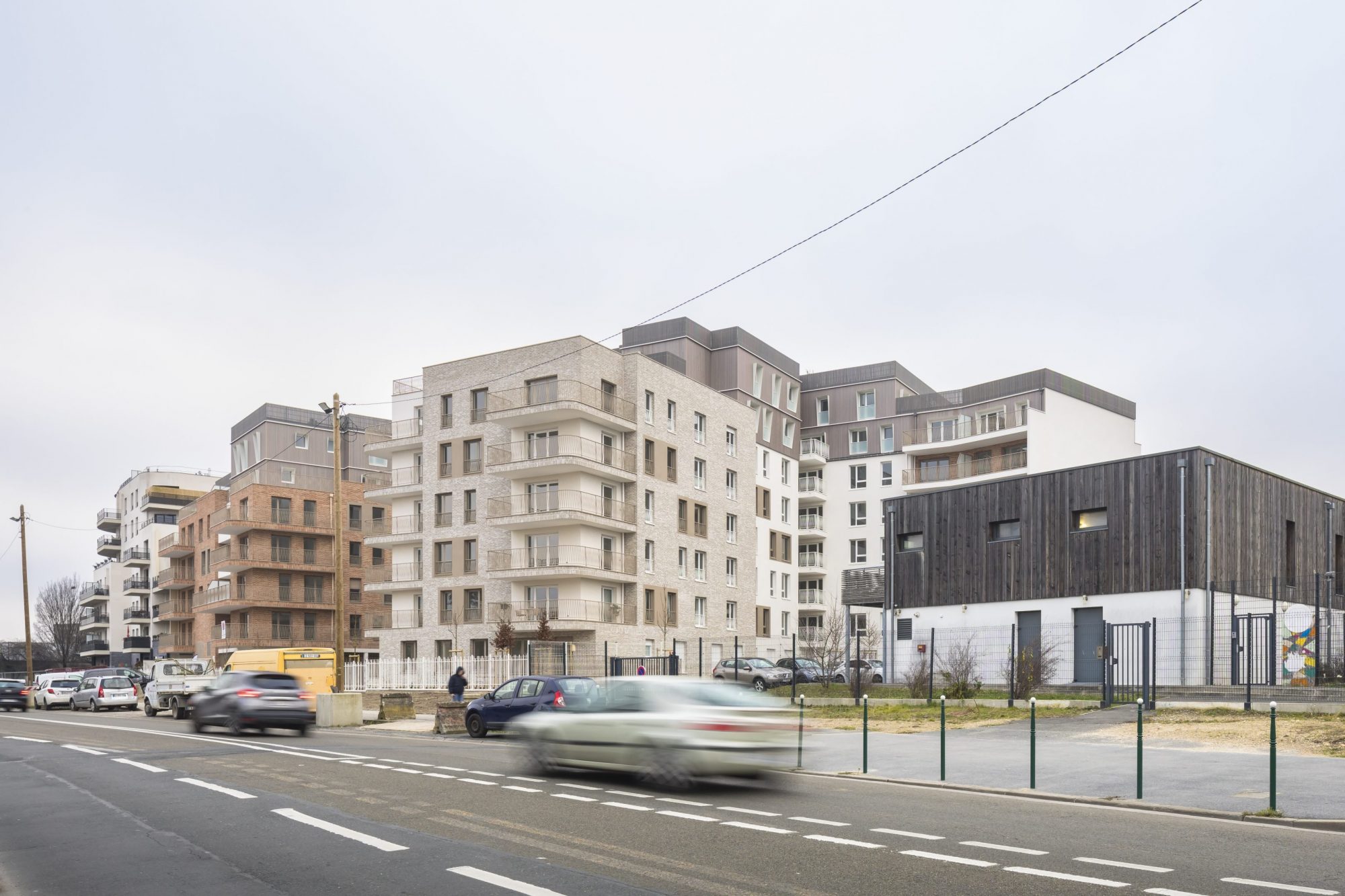140 logements collectifs dont 42 logements sociaux bénéficiant d'espaces collectifs partagés : toiture et salle commune à rez-de-chaussée.