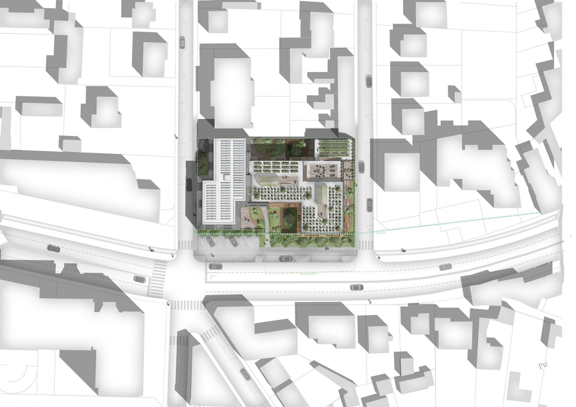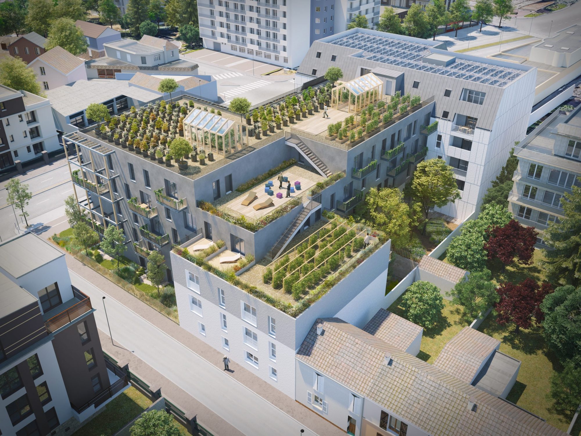 Dans l’interstice entre le tissu pavillonnaire et le tissu d’habitat collectif, le projet vient développer sa volumétrie et s’adapte à cette transition urbaine avec harmonie. Les terrasses en gradins, au nord-est du site, redescendent quant à elles progressivement vers la rue Mercière pour s’aligner sur le gabarit des maisons voisines.